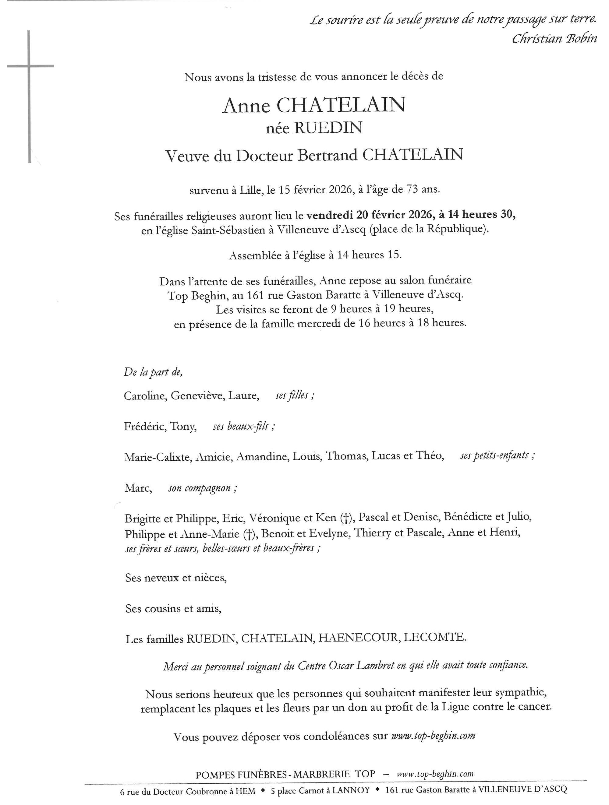 Avis de décès de Madame Anne CHATELAIN née RUEDIN