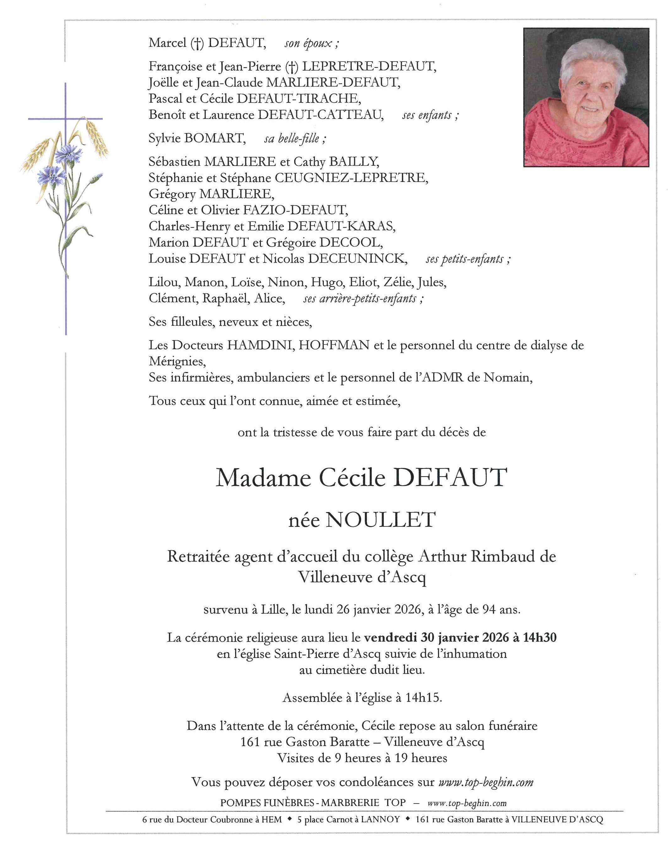 Avis de décès de Madame Cécile DEFAUT née NOULLET