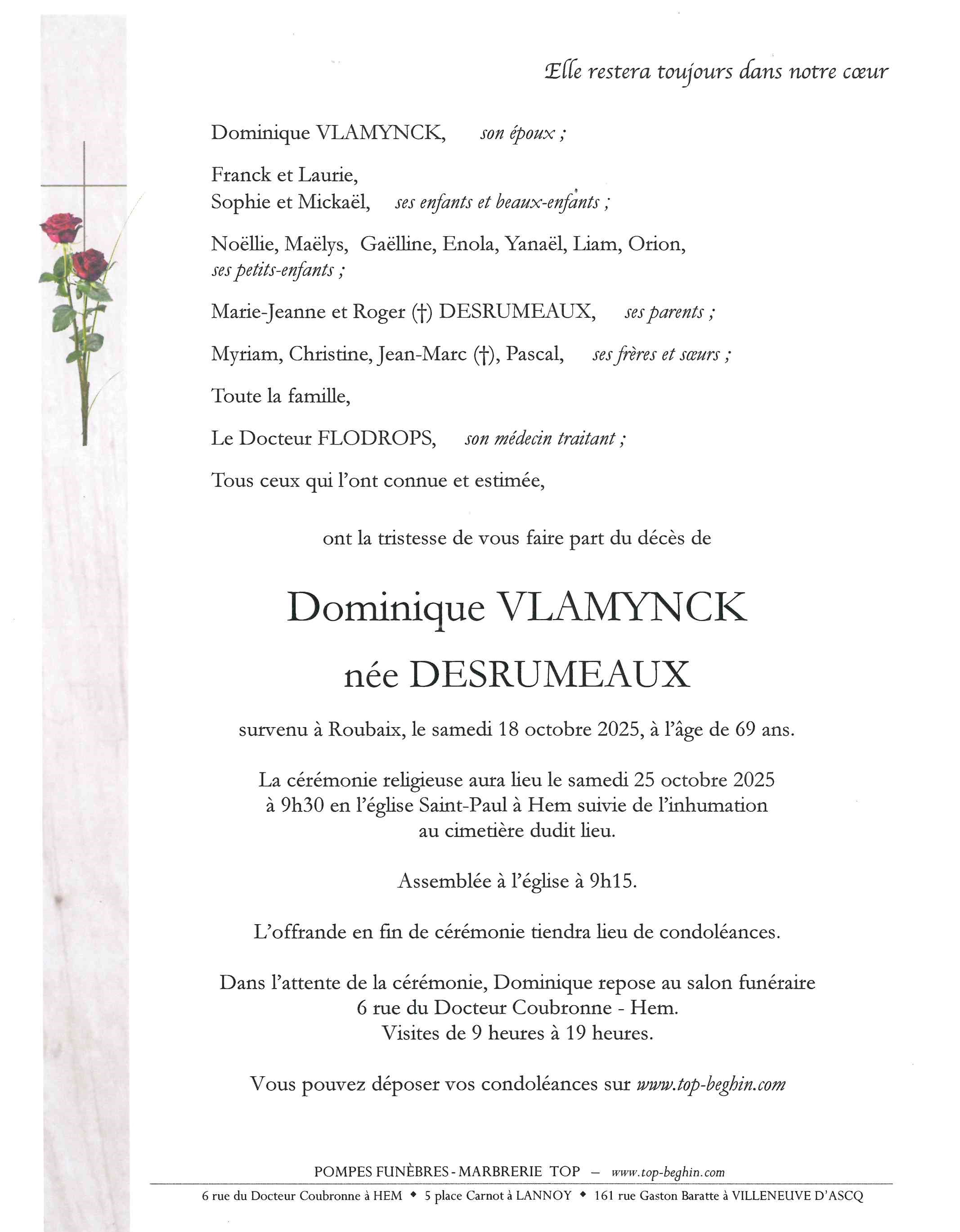 Avis de décès de Madame Dominique VLAMYNCK née DESRUMEAUX