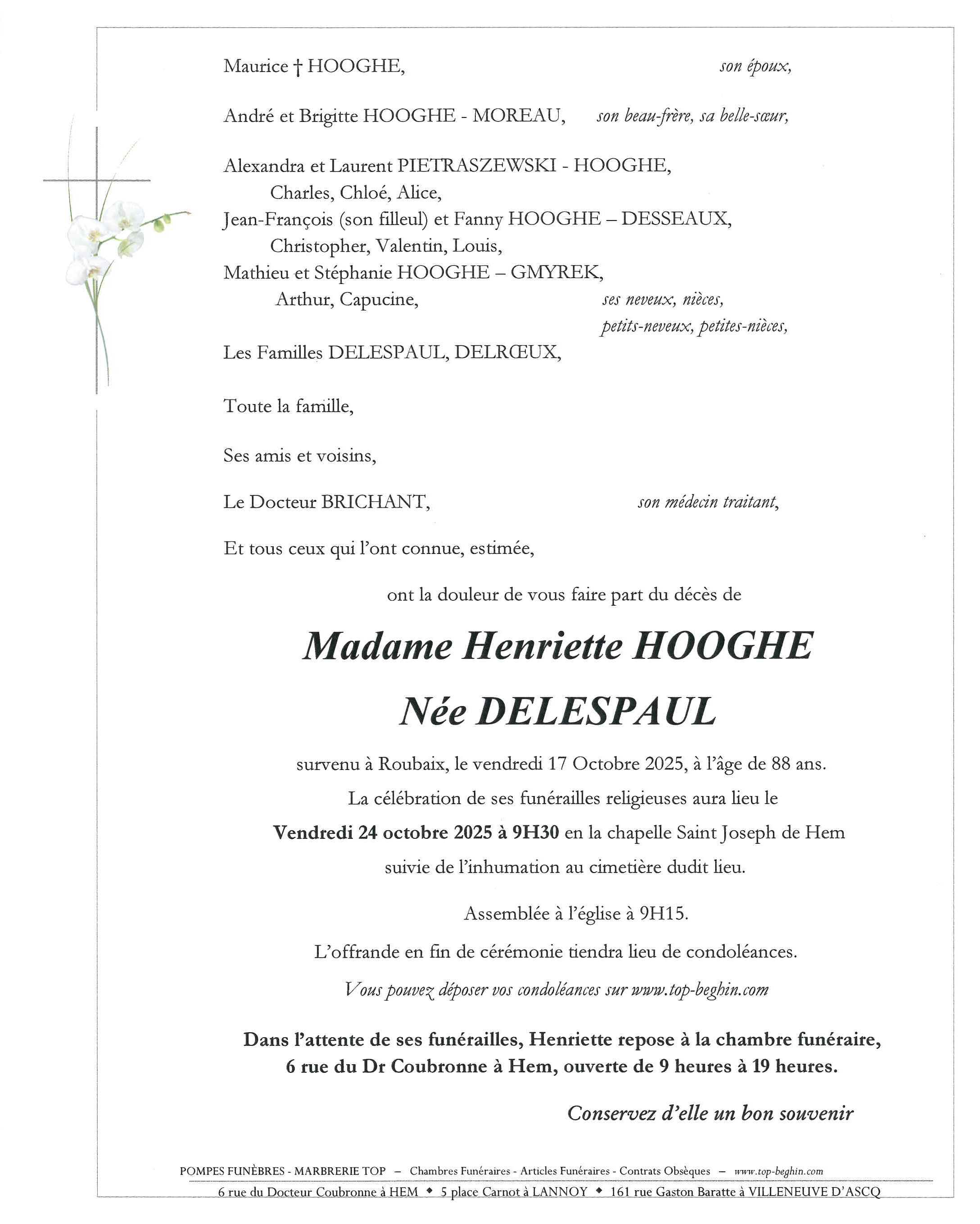 Avis de décès de Madame Henriette HOOGHE née DELESPAUL
