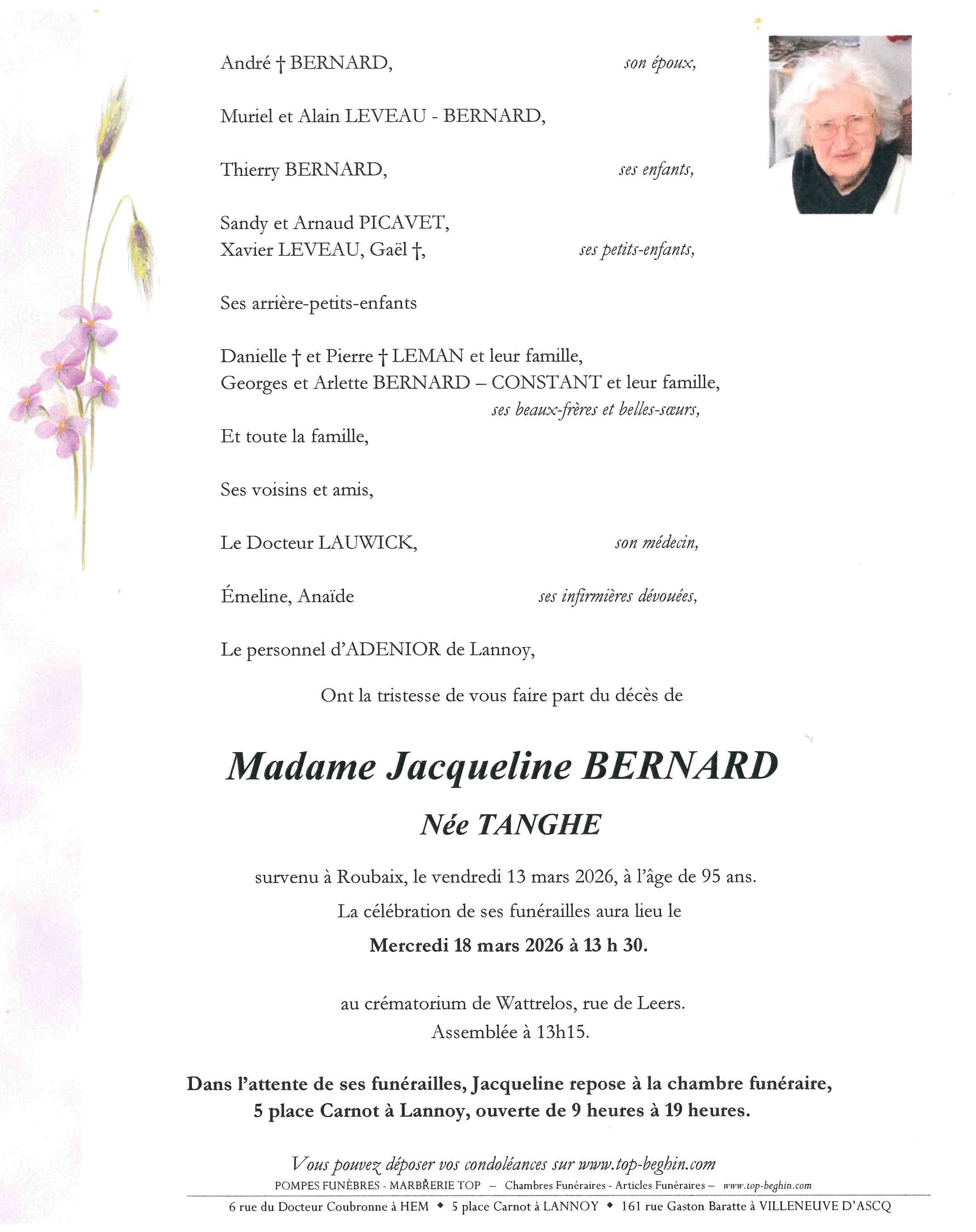 Avis de décès de Madame Jacqueline BERNARD née TANGHE