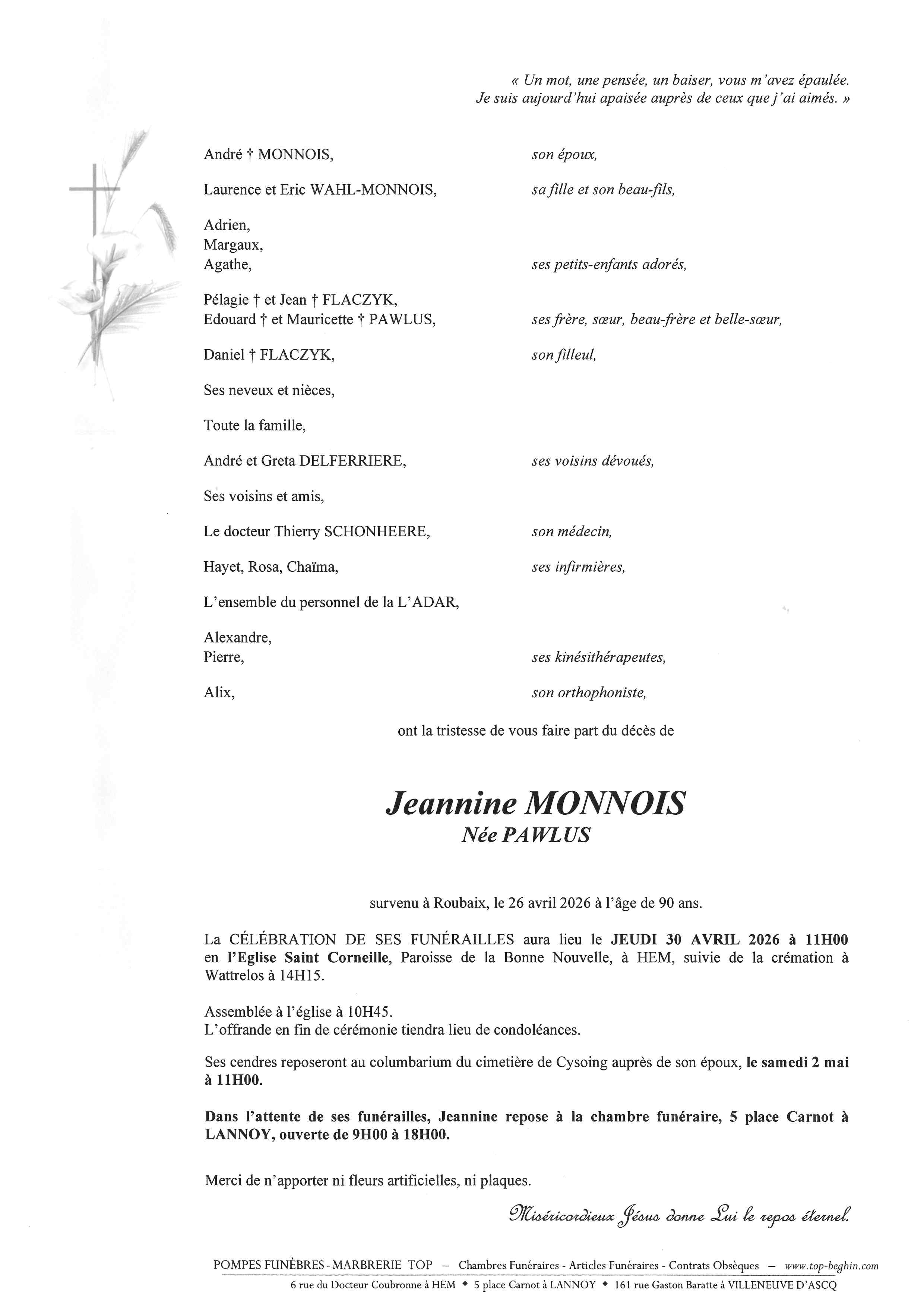 Avis de décès de Madame Jeannine MONNOIS née PAWLUS