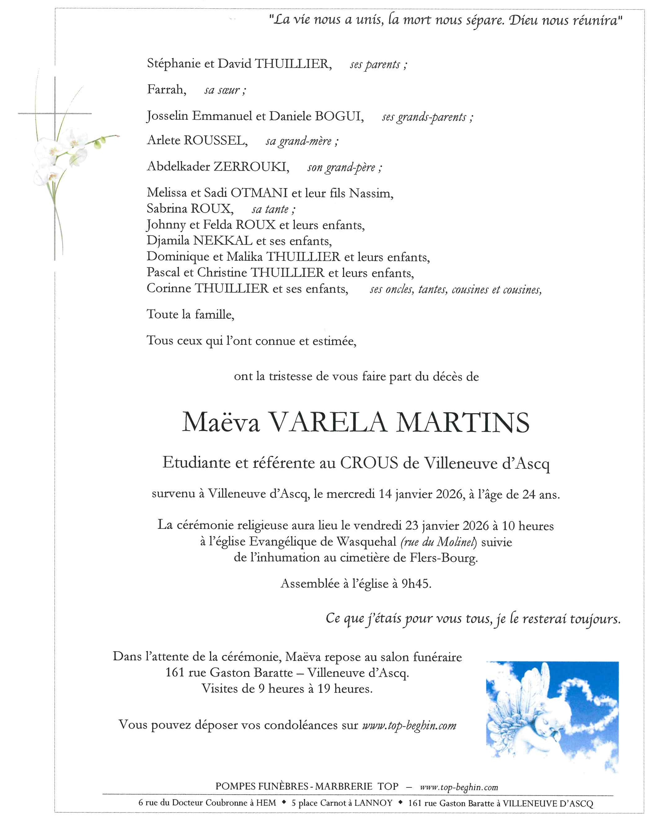 Cette page vous permet de présenter vos condoléances à la famille et de partager l'avis de décès de Maëva.