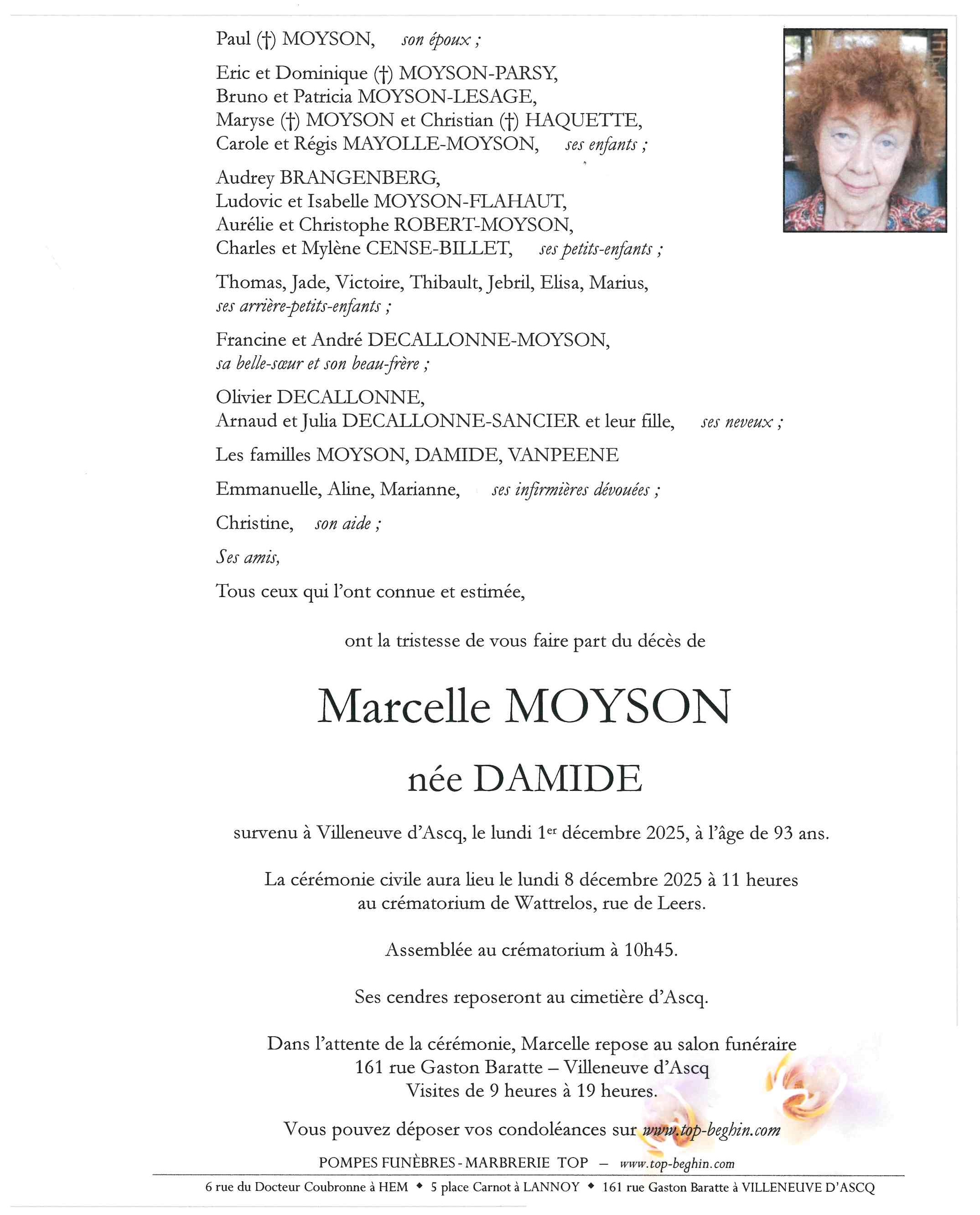Avis de décès de Madame Marcelle MOYSON née DAMIDE