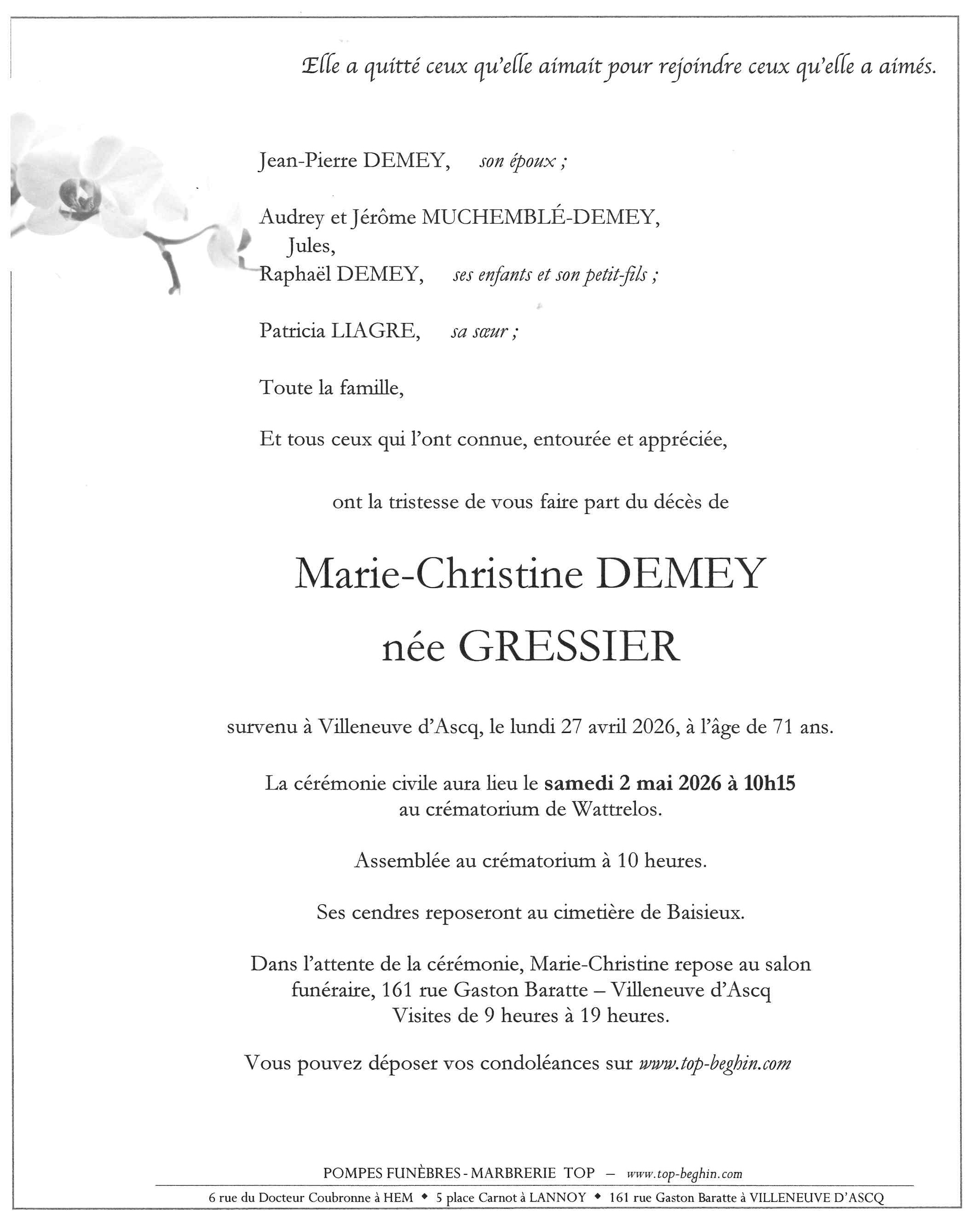 Avis de décès de Madame Marie-Christine DEMEY née GRESSIER
