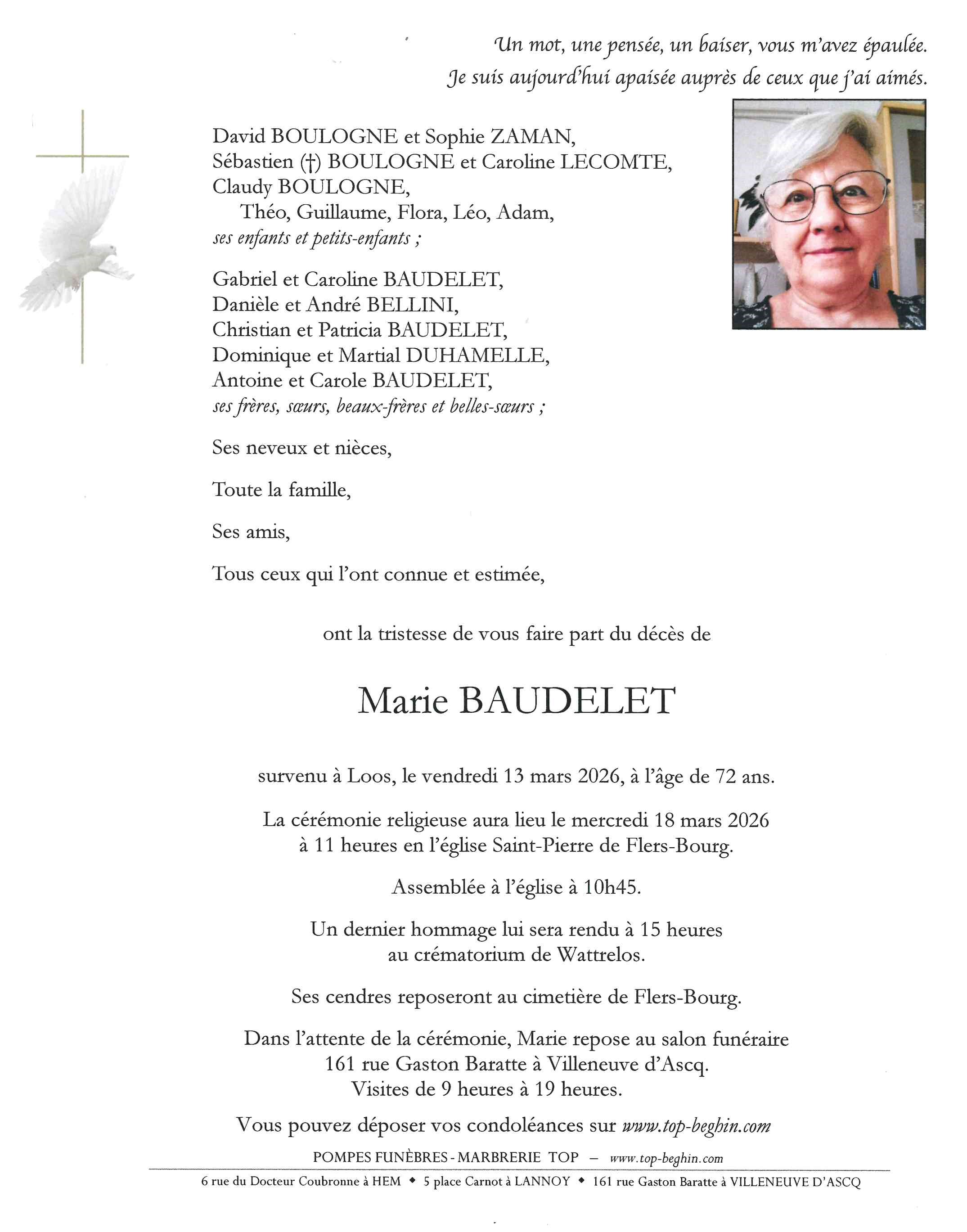 Avis de décès de Madame Marie Christine Micheline BAUDELET née BAUDELET