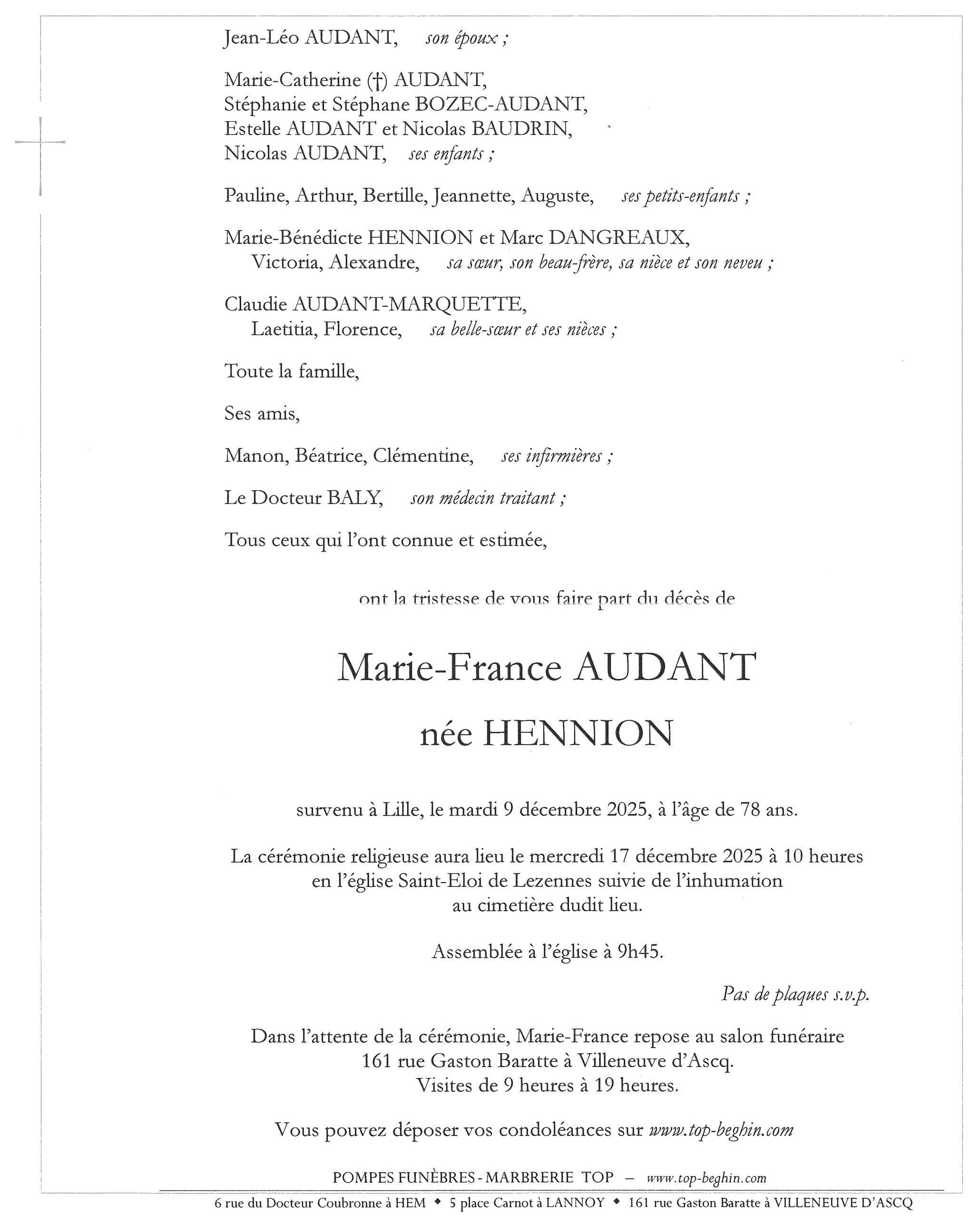 Avis de décès de Madame Marie-France AUDANT née HENNION