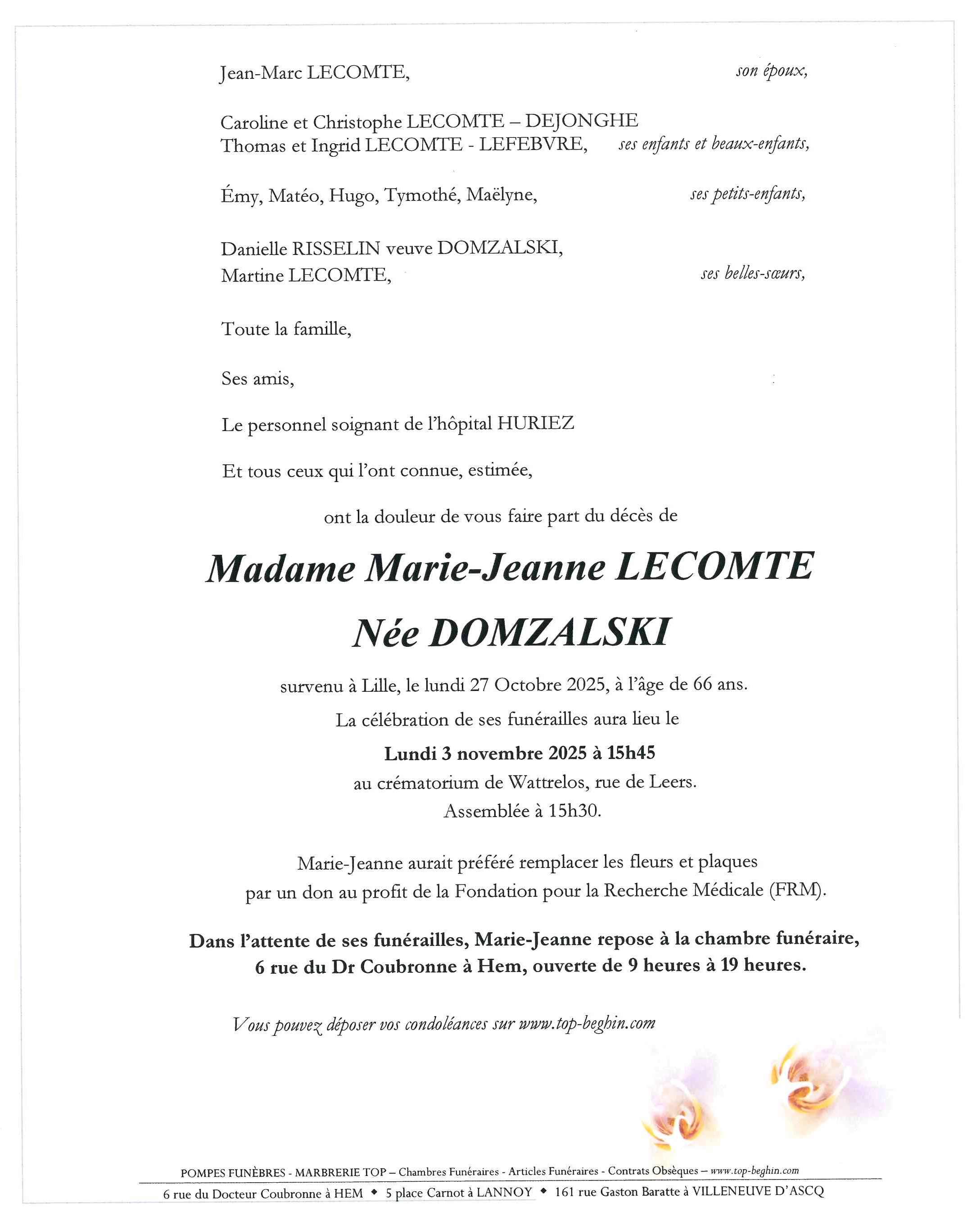 Avis de décès de Madame Marie-Jeanne LECOMTE née DOMZALSKI