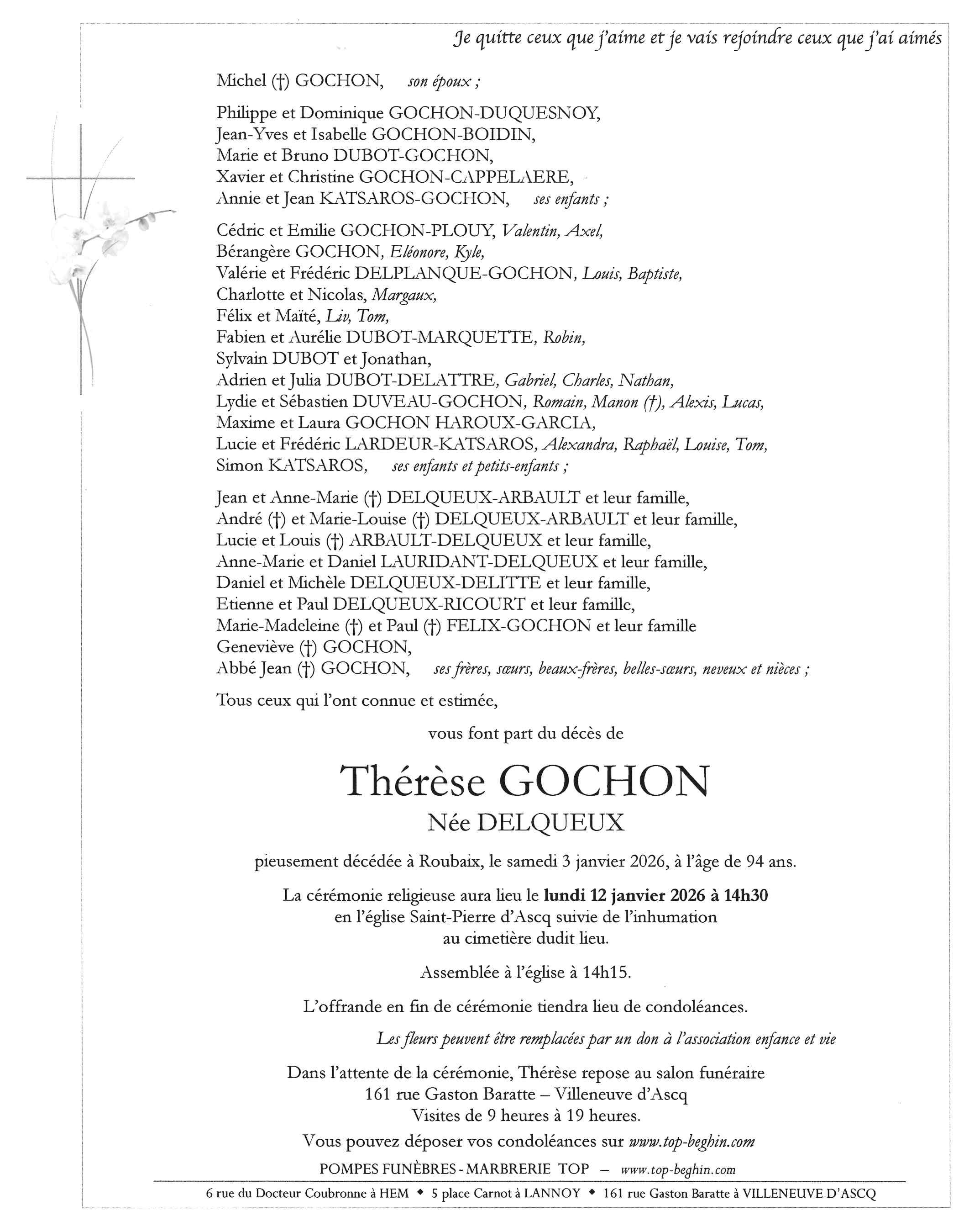 Avis de décès de Madame Marie-Thérèse GOCHON née DELQUEUX