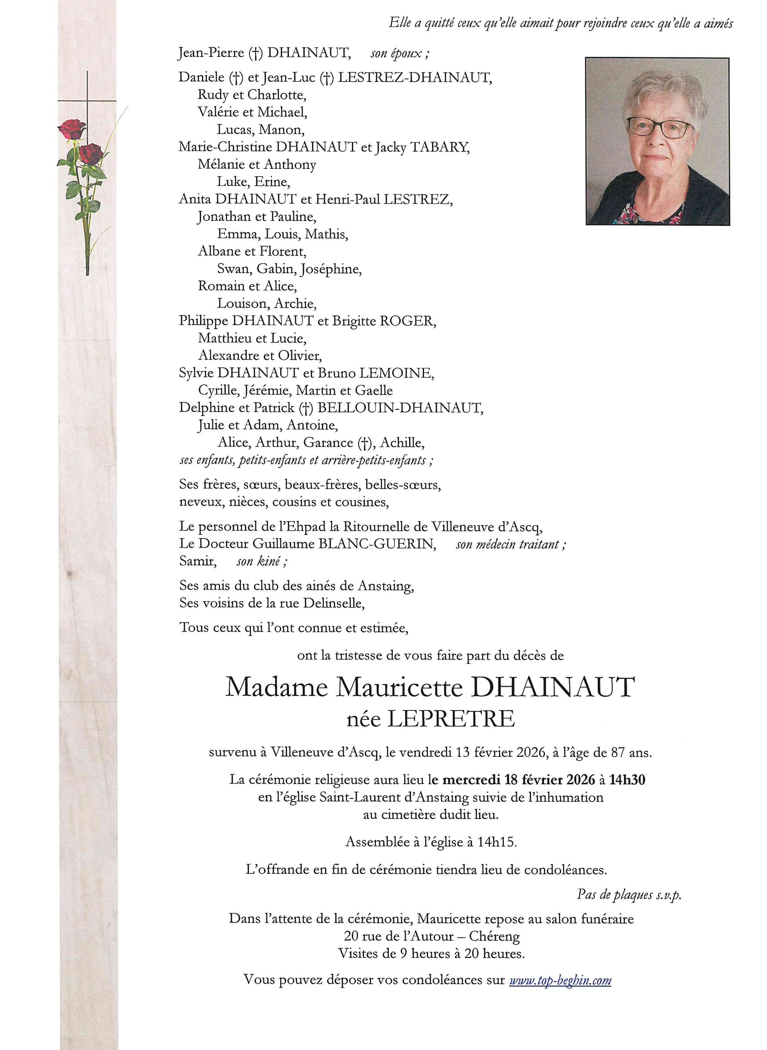 Avis de décès de Madame Mauricette DHAINAUT née LEPRETRE