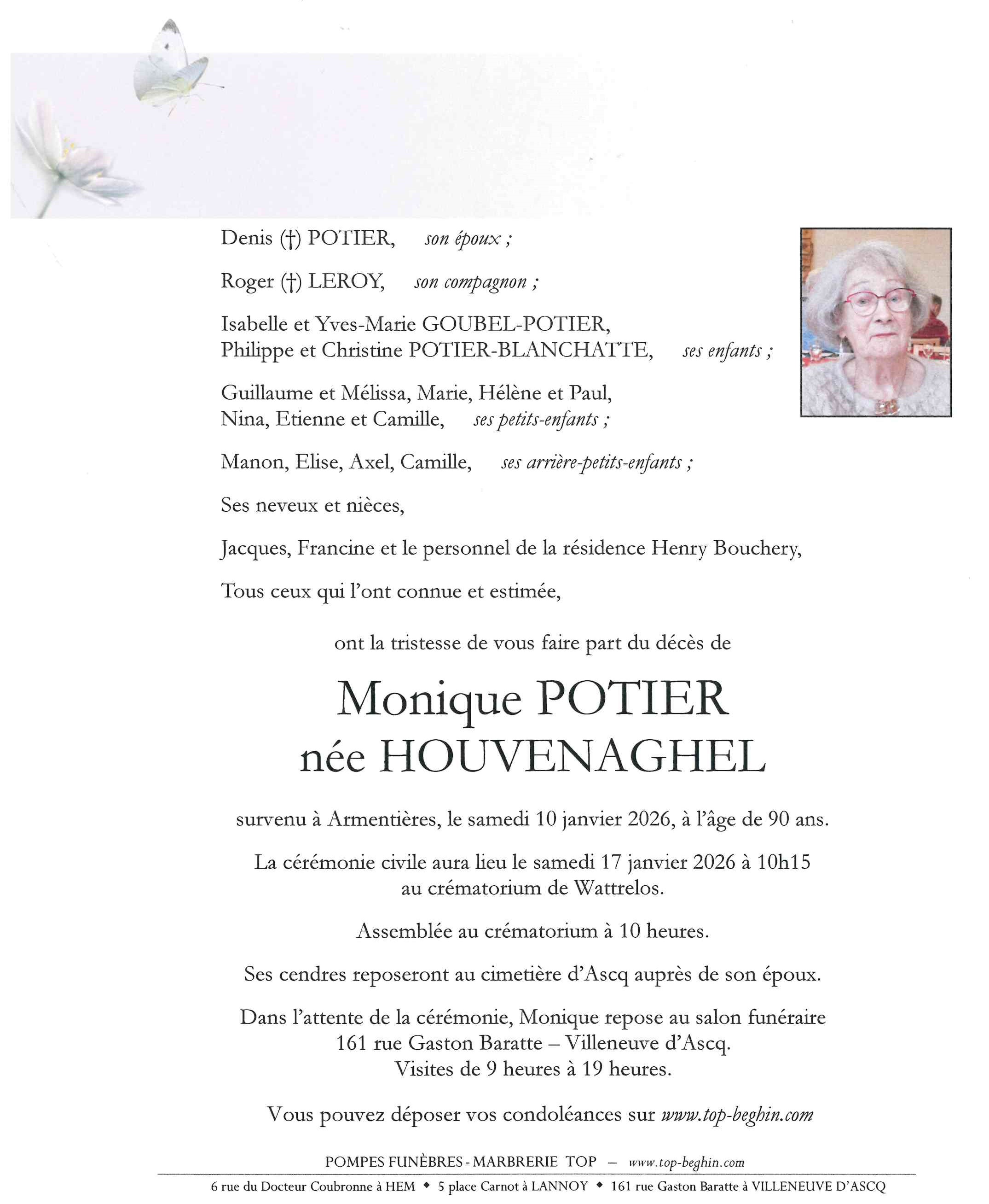 Avis de décès de Madame Monique POTIER née HOUVENAGHEL