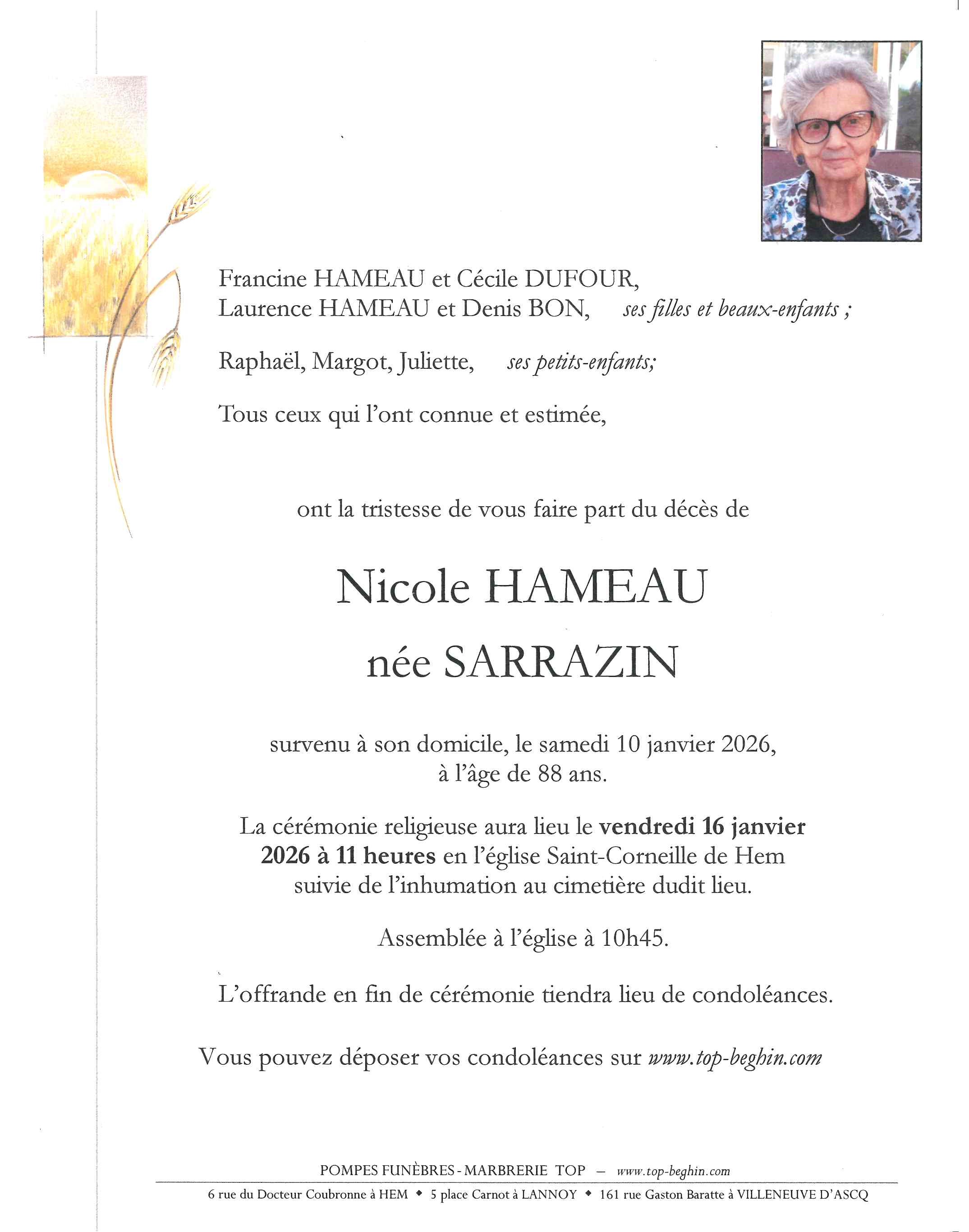 Avis de décès de Madame Nicole HAMEAU née SARRAZIN