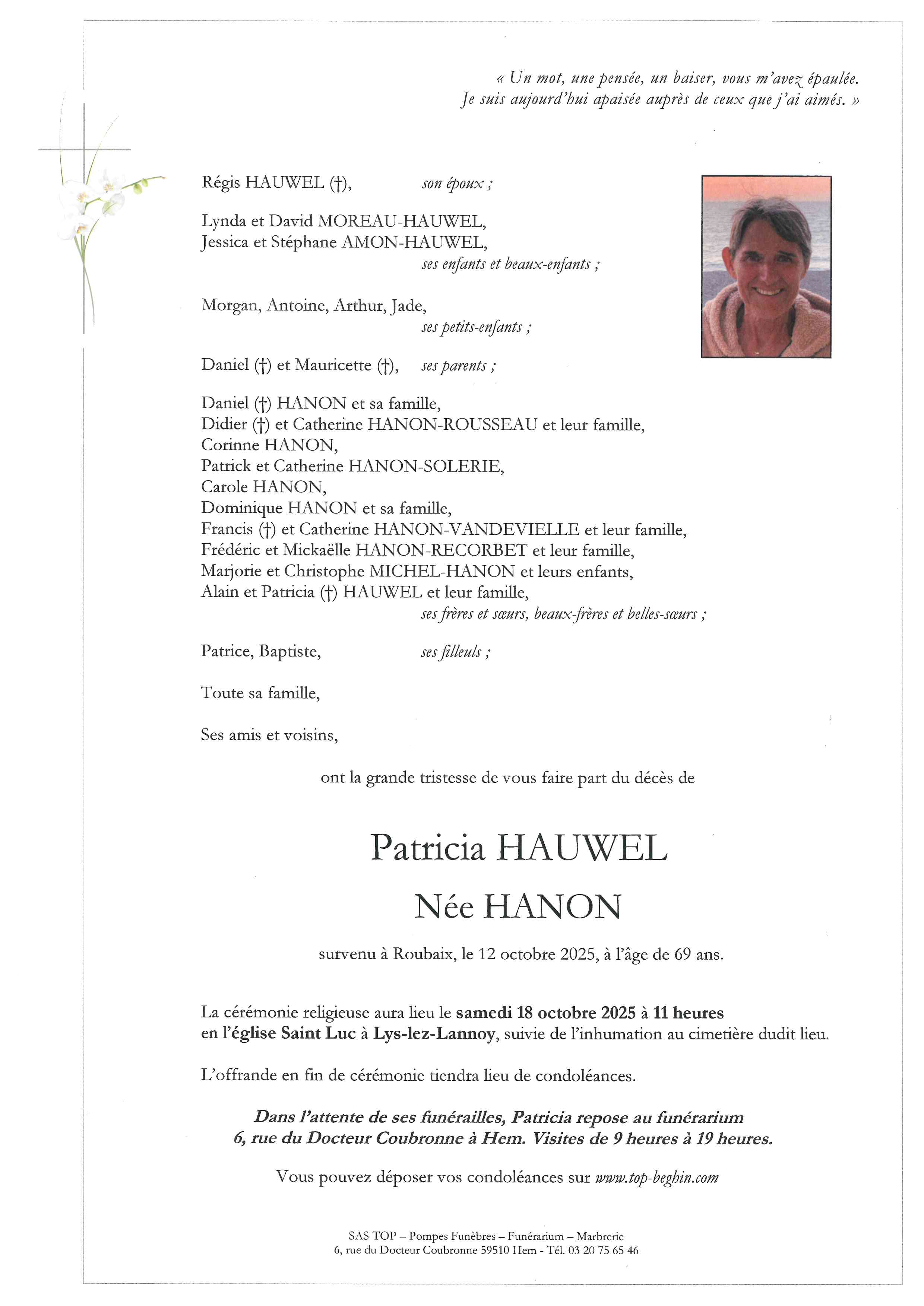 Avis de décès de Madame Patricia HAUWEL née HANON