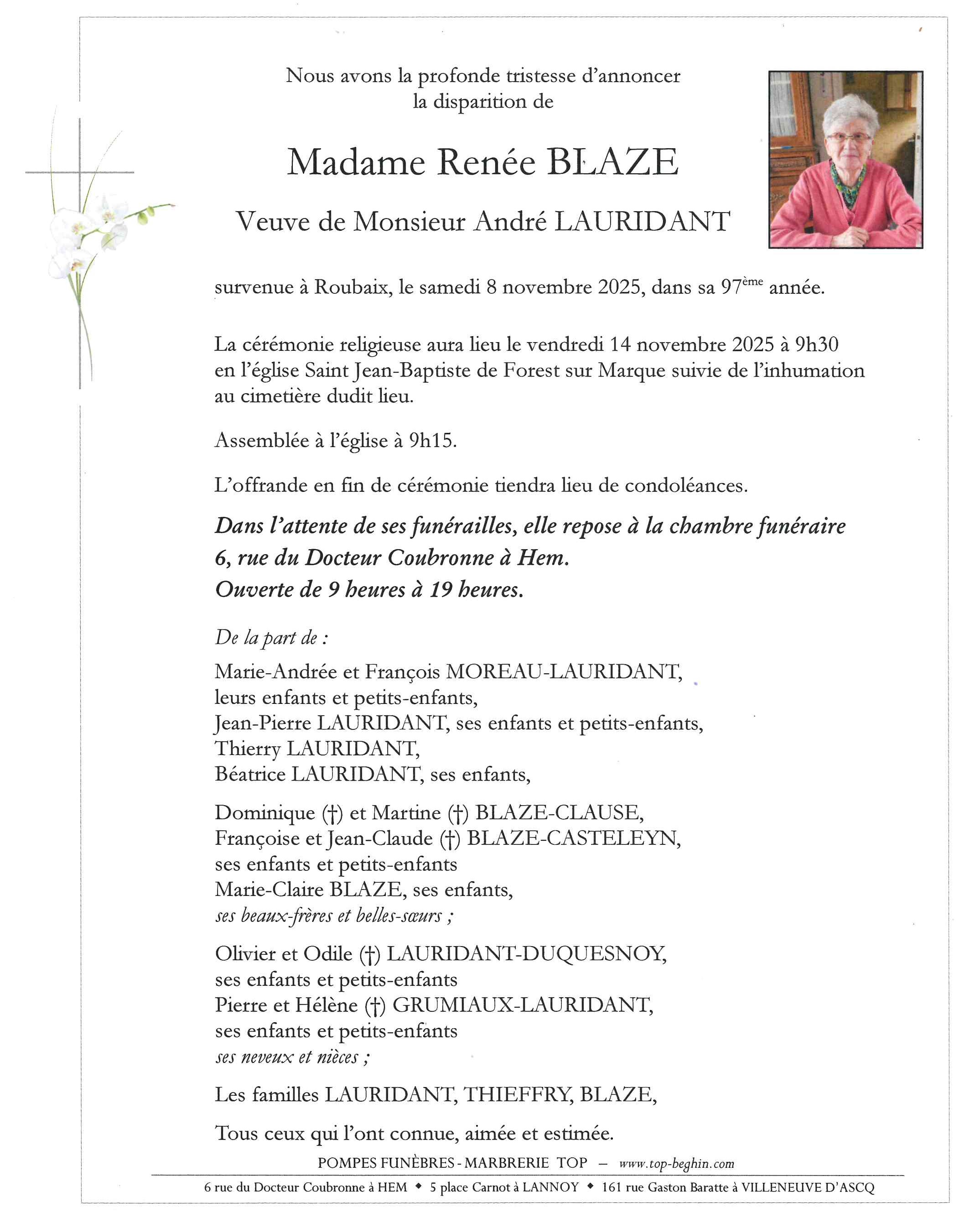 Avis de décès de Madame Renée LAURIDANT née BLAZE