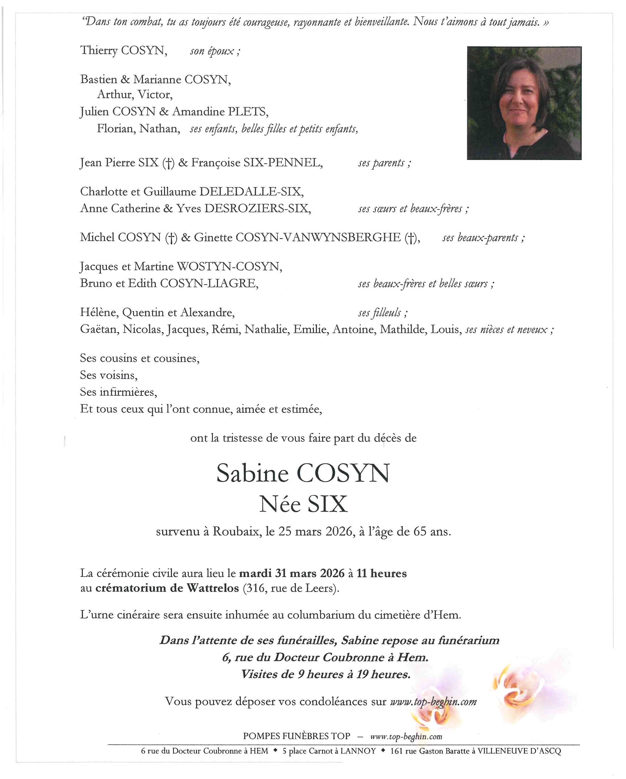 Avis de décès de Madame Sabine COSYN née SIX