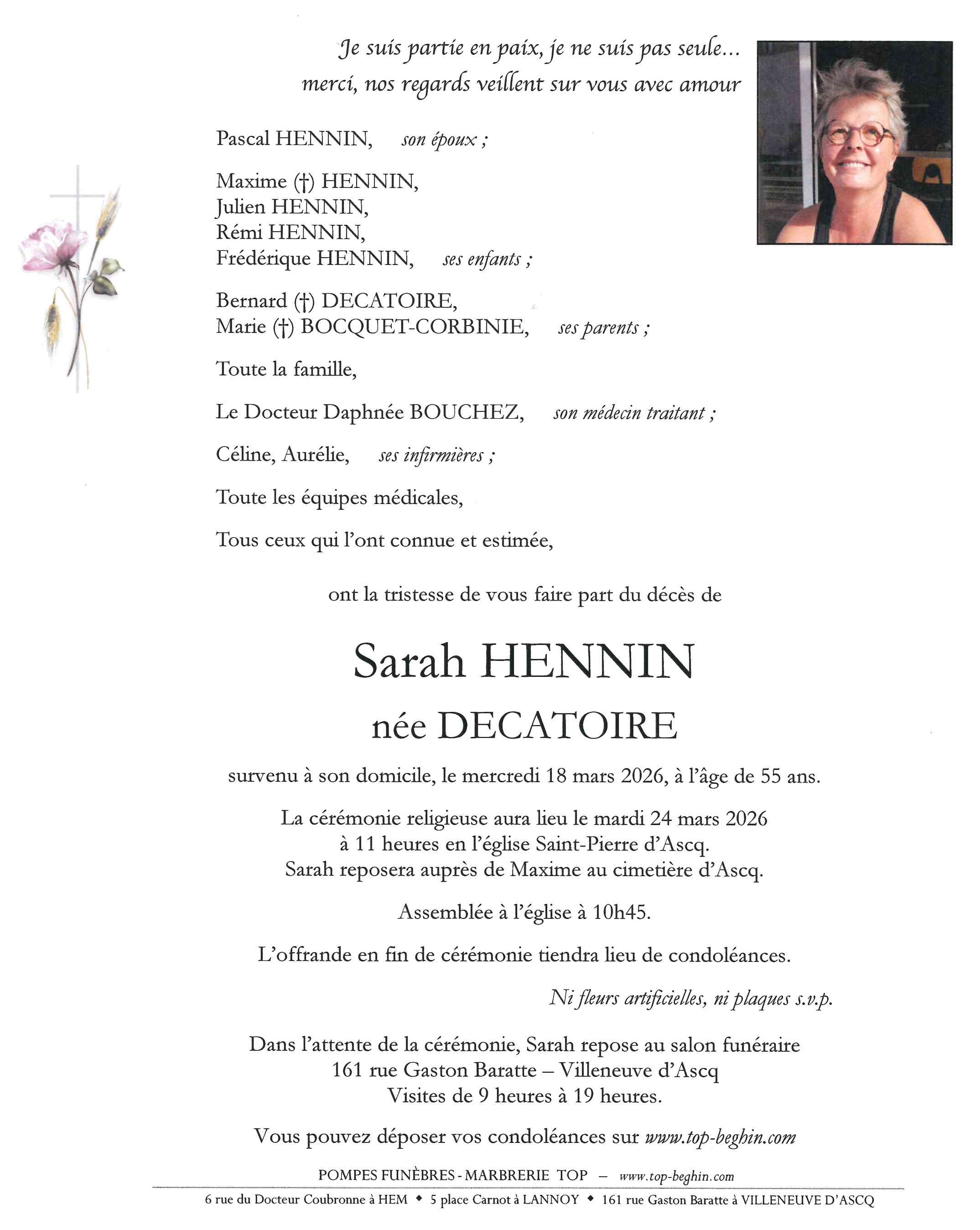 Avis de décès de Madame Sarah HENNIN née DECATOIRE