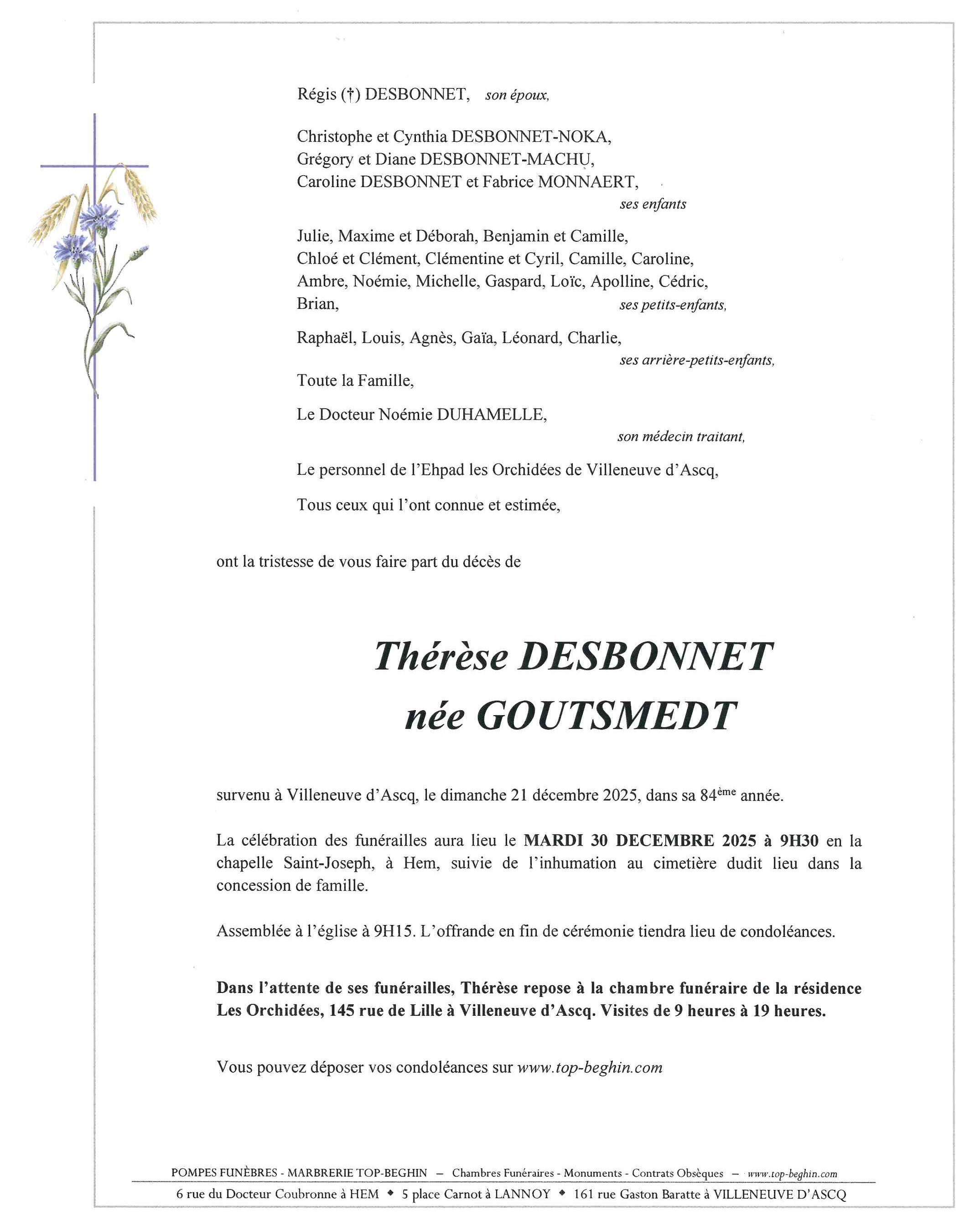 Avis de décès de Madame Thérèse DESBONNET née GOUTSMEDT