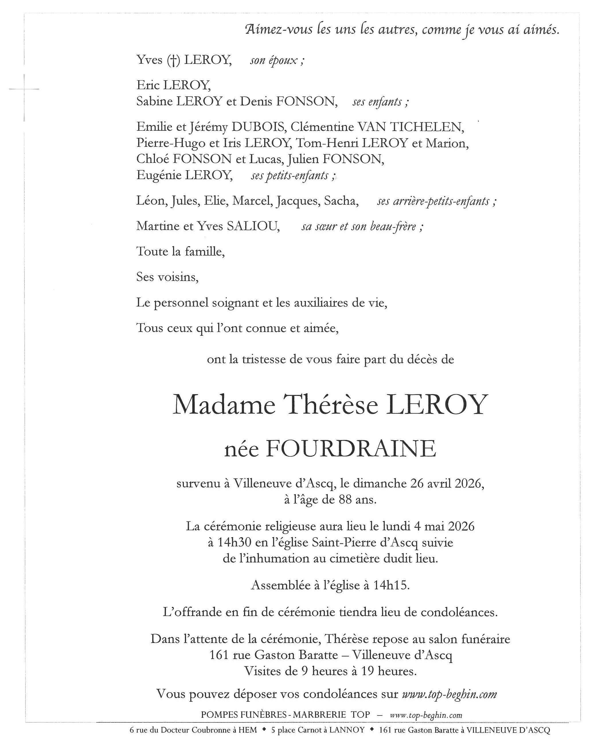 Avis de décès de Madame Thérèse Mathilde Ghislaine LEROY née FOURDRAINE
