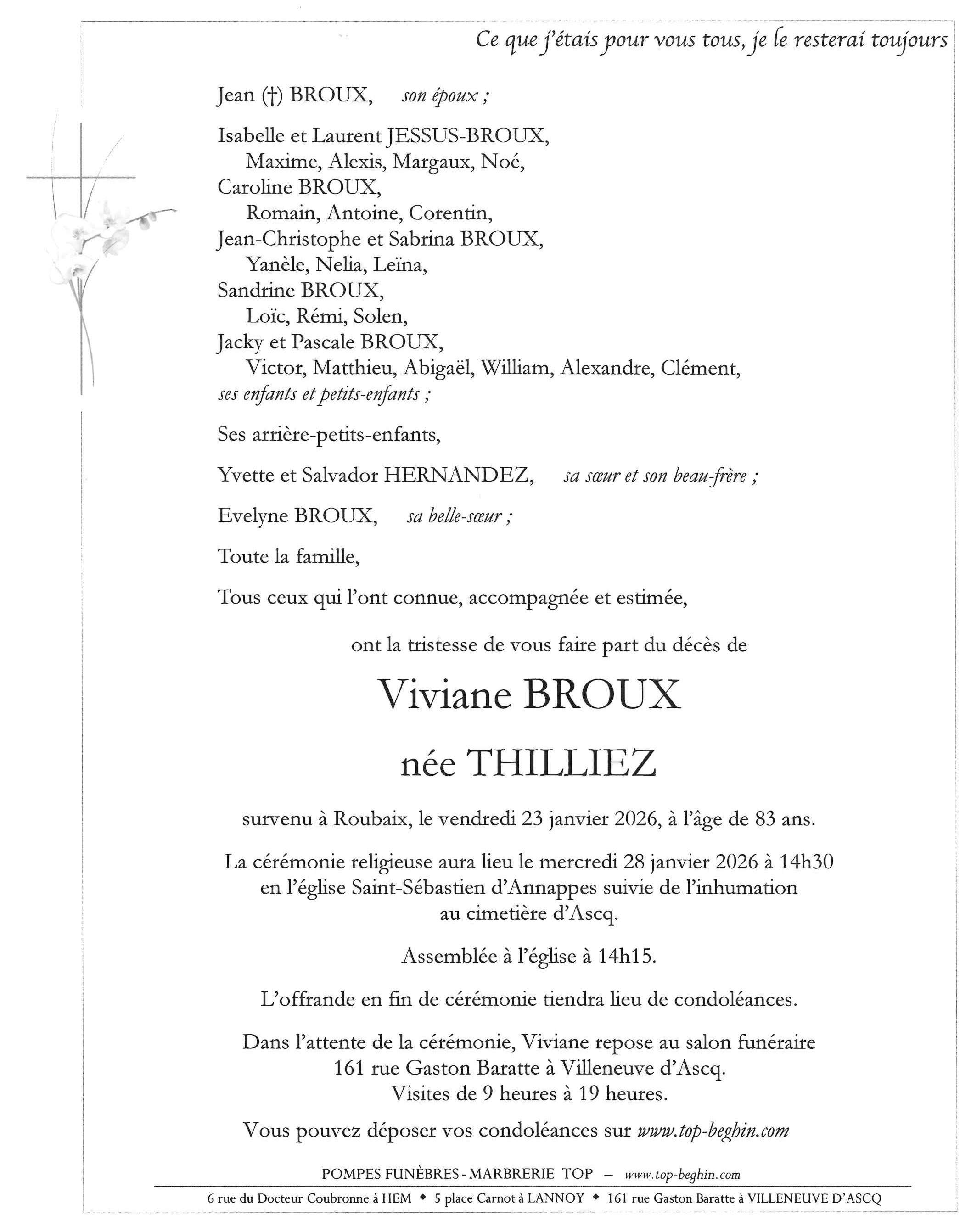 Avis de décès de Madame Viviane Pauline Henriette BROUX née THILLIEZ
