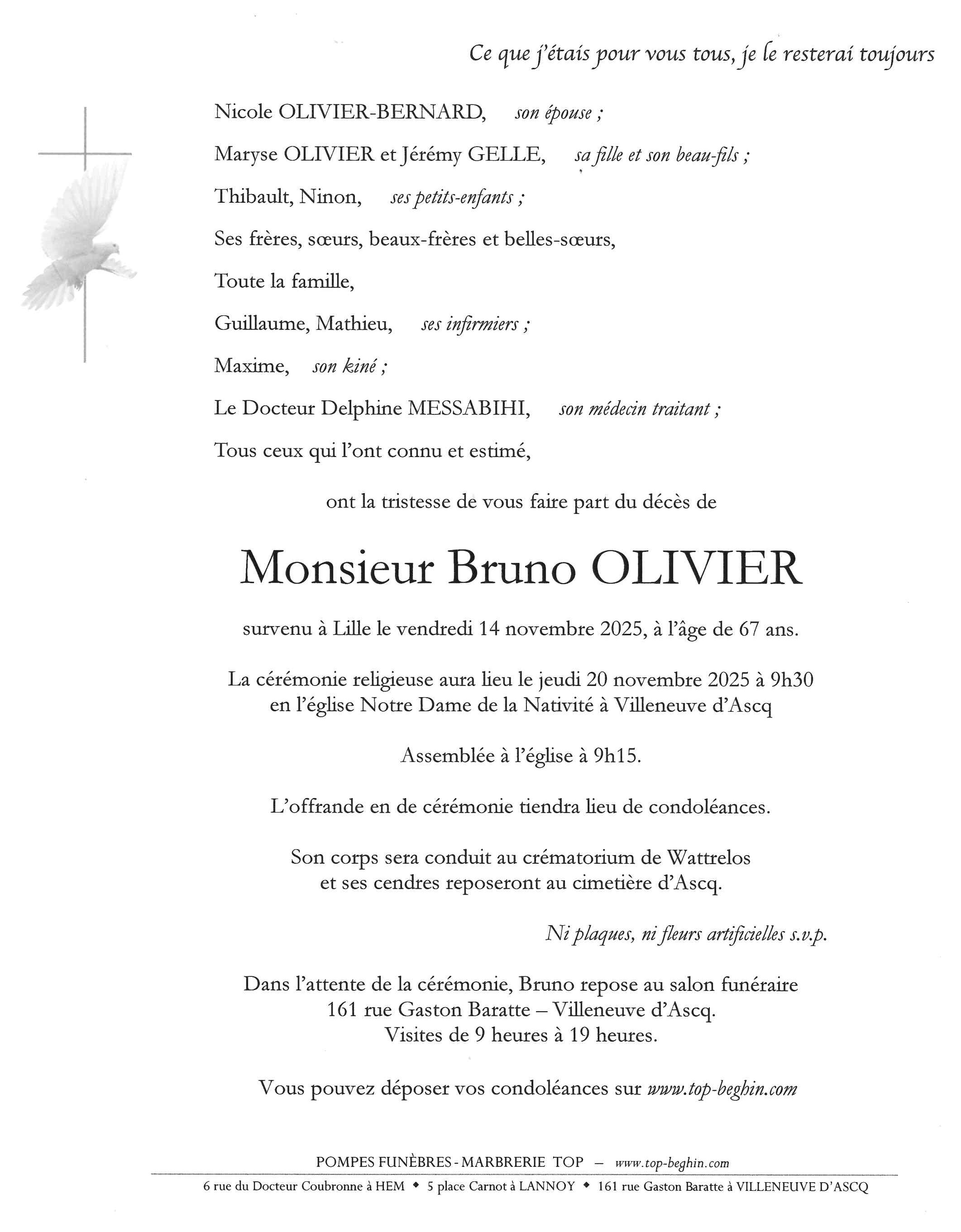 Cette page vous permet de présenter vos condoléances à la famille et de partager l'avis de décès de Bruno.