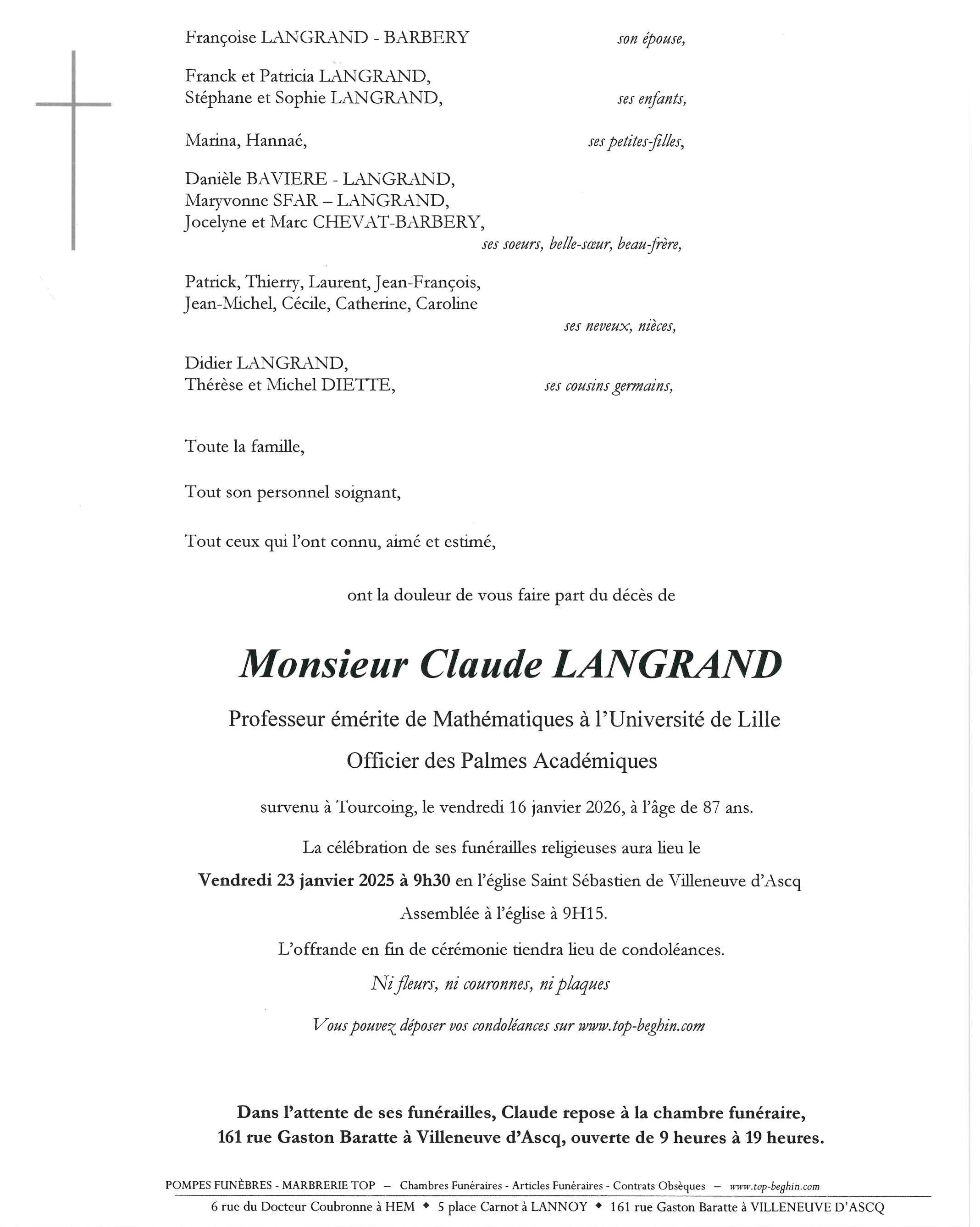 Avis de décès de Monsieur Claude LANGRAND