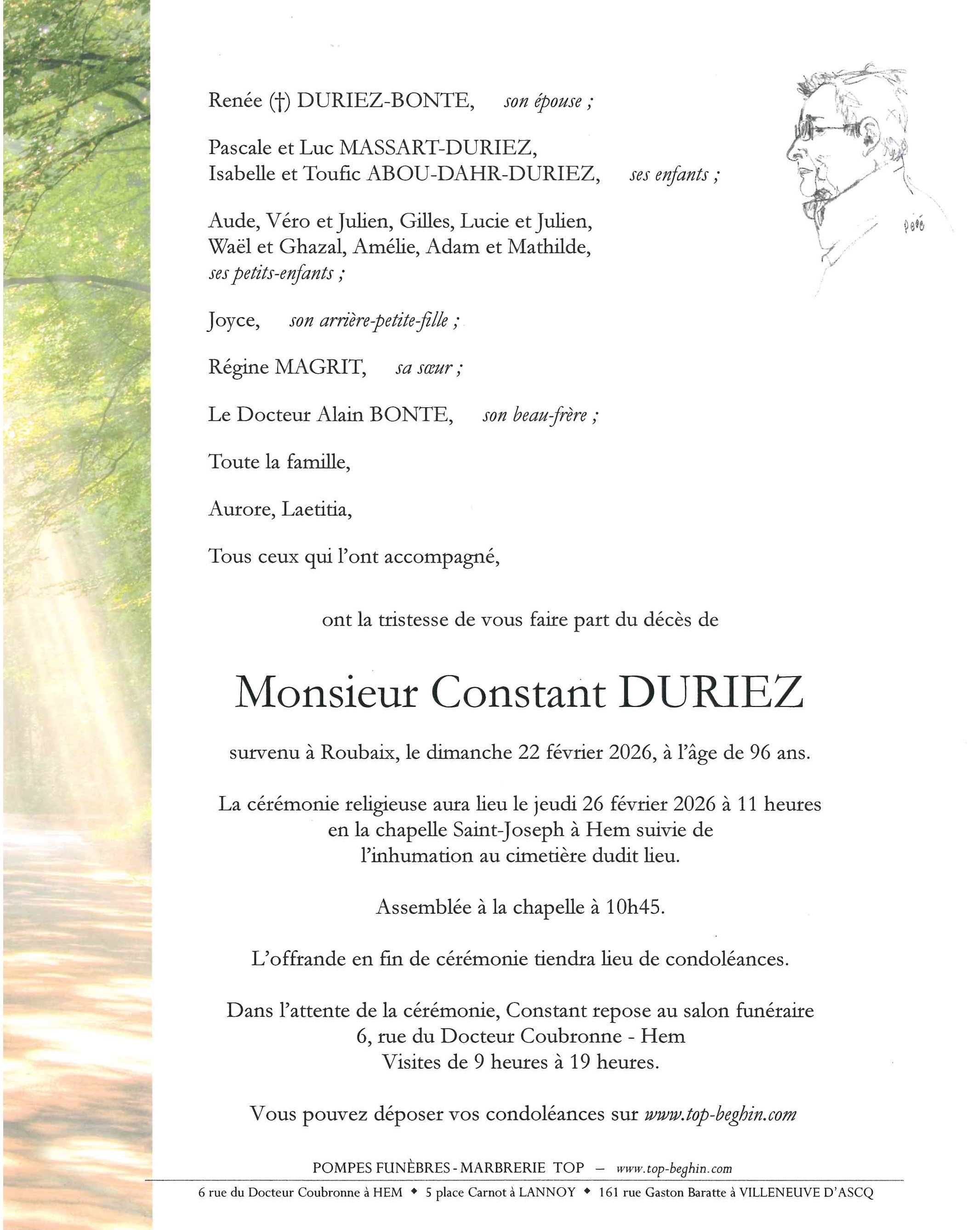 Avis de décès de Monsieur Constant Roger DURIEZ