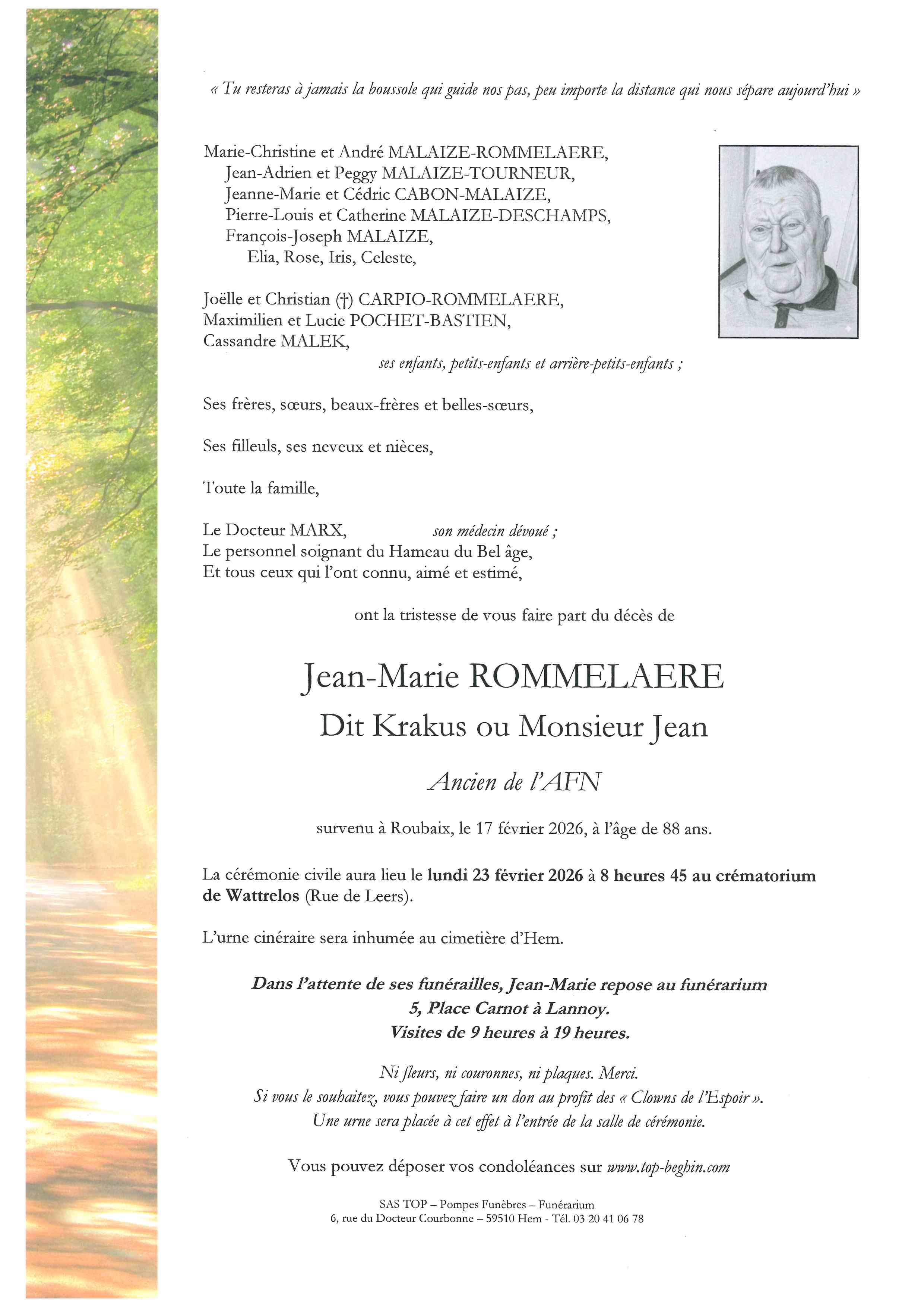 Avis de décès de Monsieur Jean-Marie ROMMELAERE