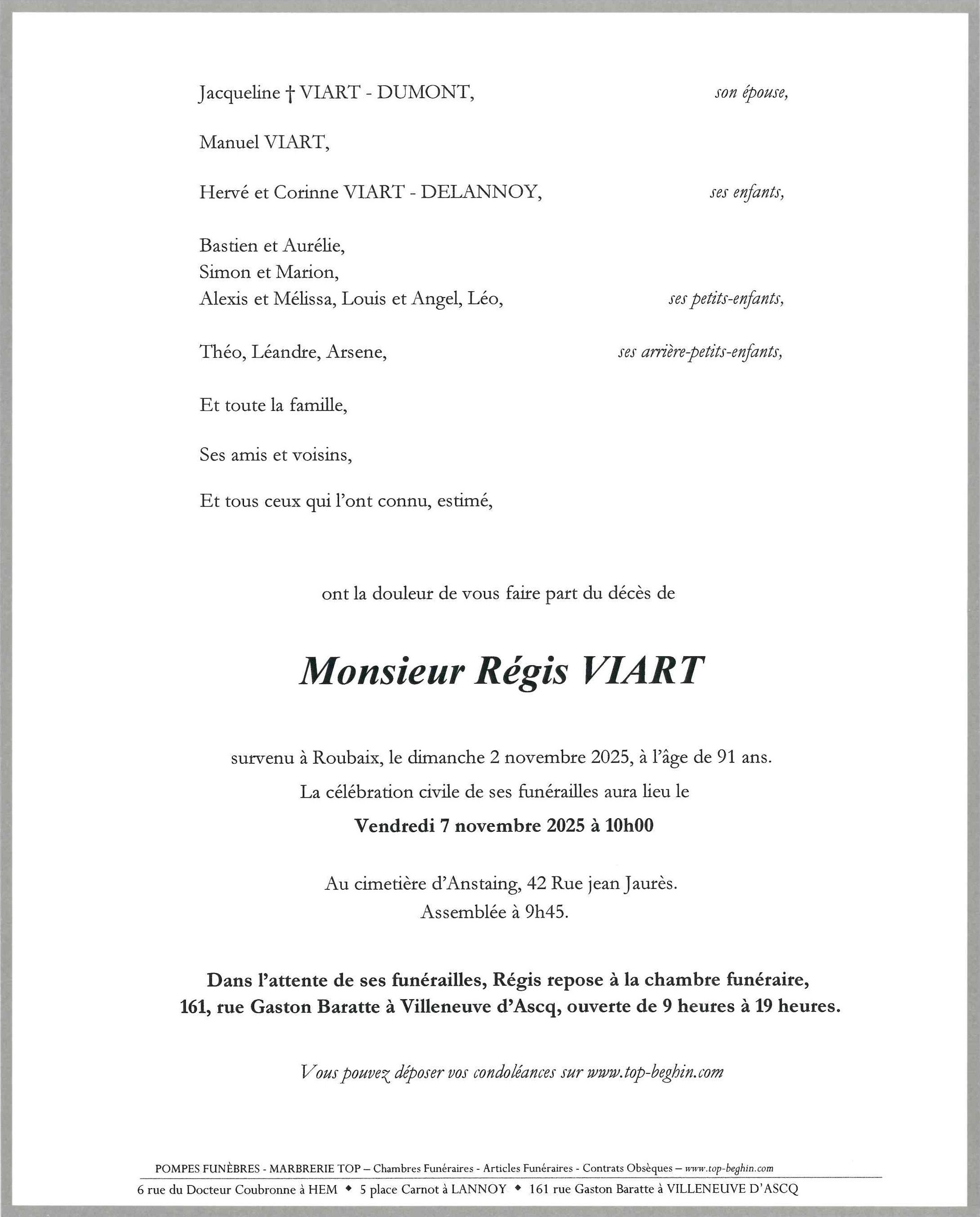 Cette page vous permet de présenter vos condoléances à la famille et de partager l'avis de décès de Régis.